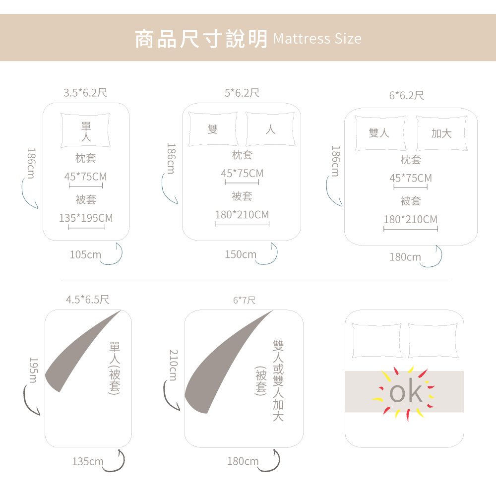 單人薄床包3.5x6.2尺(105x186cm) x1 / 可包覆床墊厚度:約28cm±5%