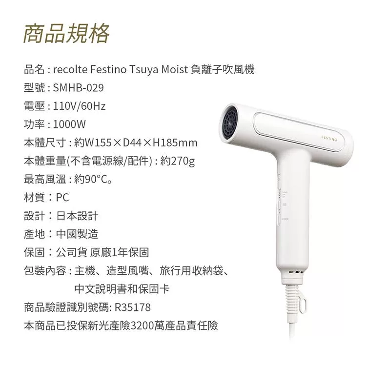 品名 : recolte 日本麗克特Festino Tsuya Moist 負離子吹風機